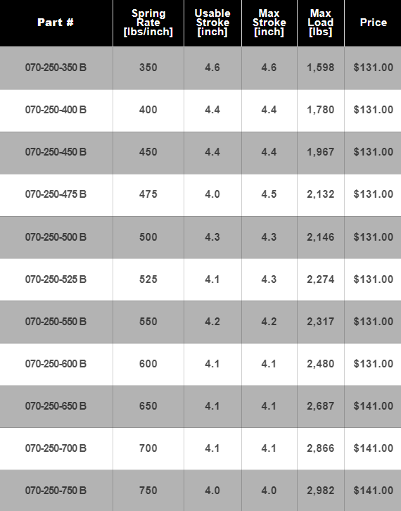 Part # Spring Rate [lbs/inch] Usab
