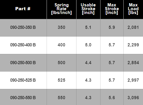 Part # Spring Rate [lbs/inch] Usab